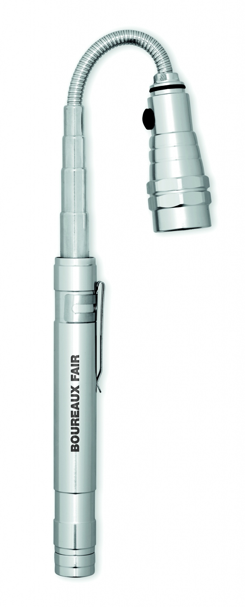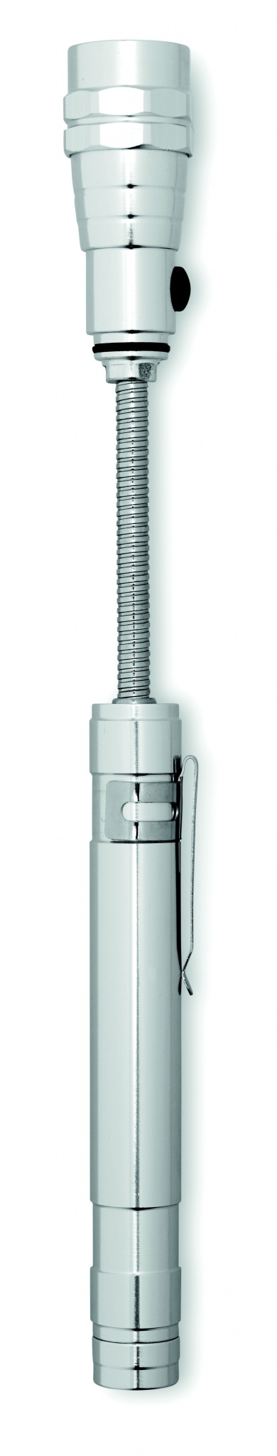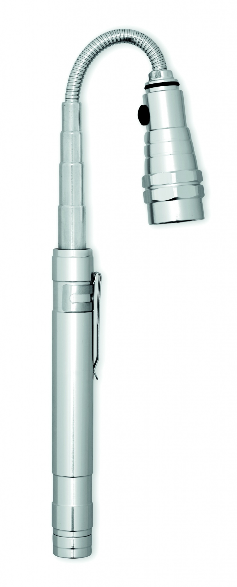 Фонарик с выдвижной ручкой и гнущимся кончиком.На ободке установлен магнит, так вы сможете достать мелкие металлические детали, не нагибаясь. Максимальная длина 57 см. 4 батарейки установлены в фонарь.