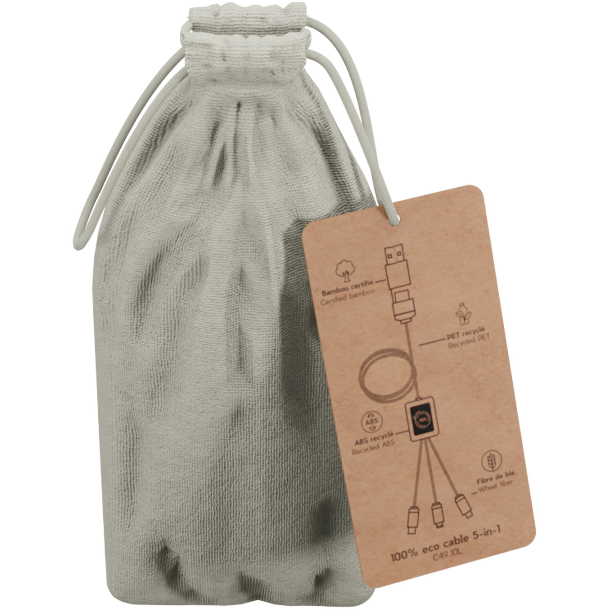Кабель для быстрой зарядки на 2,4 А (3 x 10 см), обе стороны которого можно персонализировать разными светящимися логотипами. Кабель полностью изготовлен из более экологичных материалов: переработанных ПЭТ-кабелей, бамбука, пшеничных волокон и переработанной пластмассы. Зарядный кабель универсален благодаря 3 выходам (Type-C, Android, iPhone) и может заряжать до трех устройств одновременно. Благодаря двойному входу USB и USB-C кабель совместим с новейшими зарядными устройствами. Поставляется в хлопковой сумке (20 x 8 см) с карточкой из крафт-бумаги.