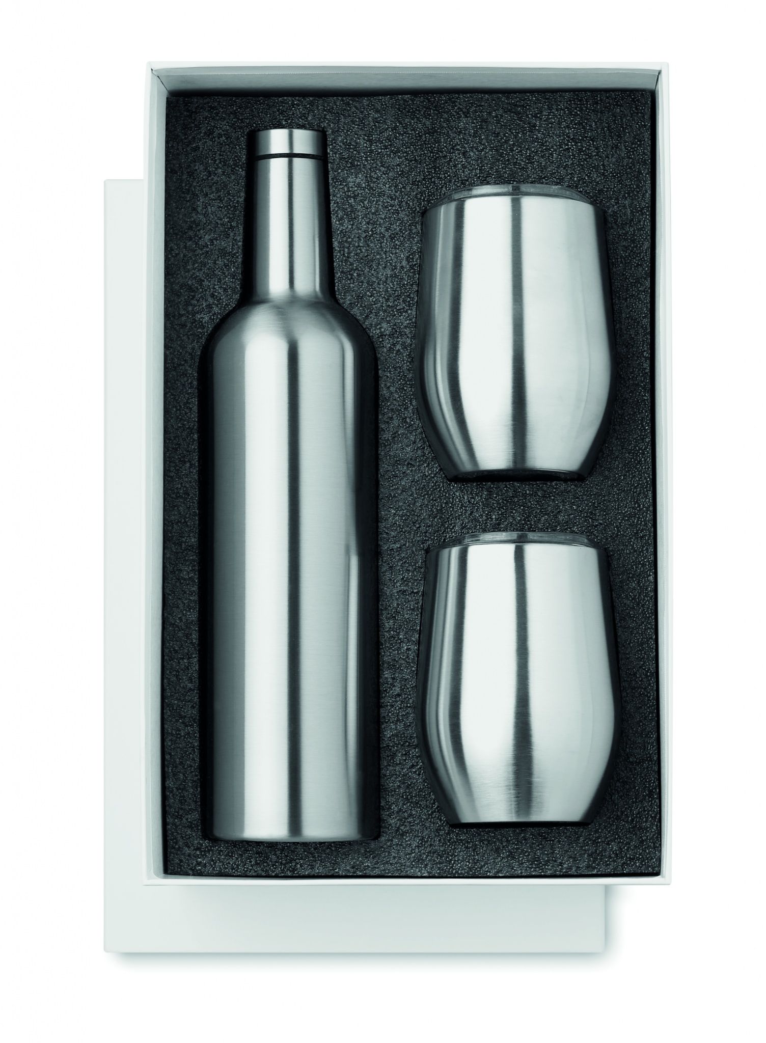 Набор: бутылка 750 мл и 2 кружки объемом 350 мл. Двойные стенки, нержавеющая сталь. Не протекает.