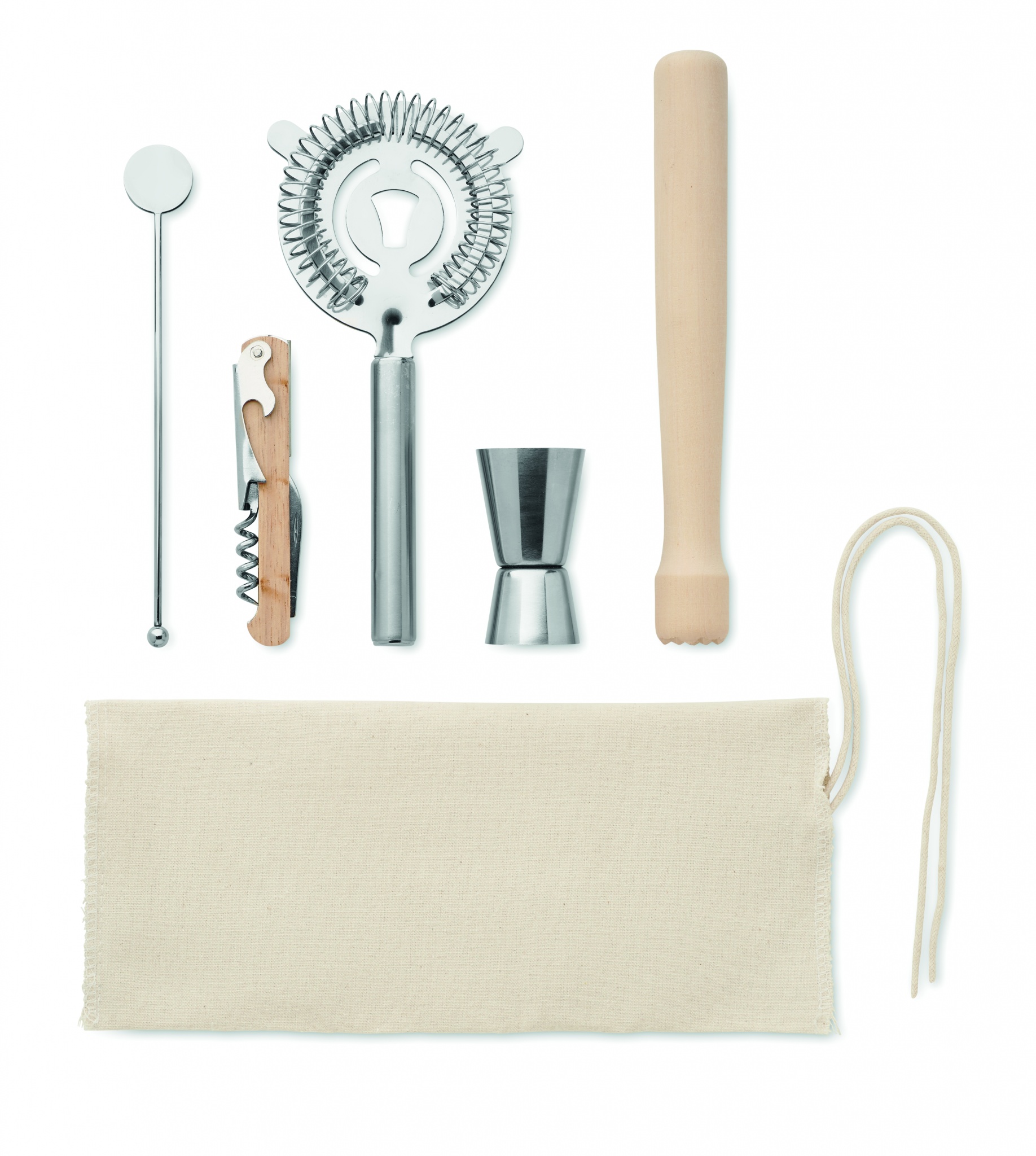 Набор для коктейлей в хлопковом мешочке на завязках. В набор входят 5 предметов: двусторонний мерный джиггер (15 и 30 мл), деревянный маддлер, ситечко для коктейлей, мешалка для напитков и штопор. Мешочек плотностью 220 гр/м².