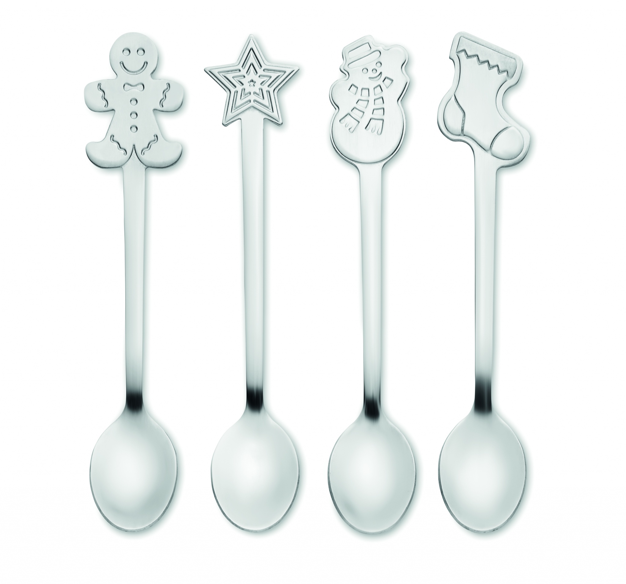 Набор из 4 чайных ложек из нержавеющей стали с рождественскими мотивами. Поставляется в подарочной коробке.