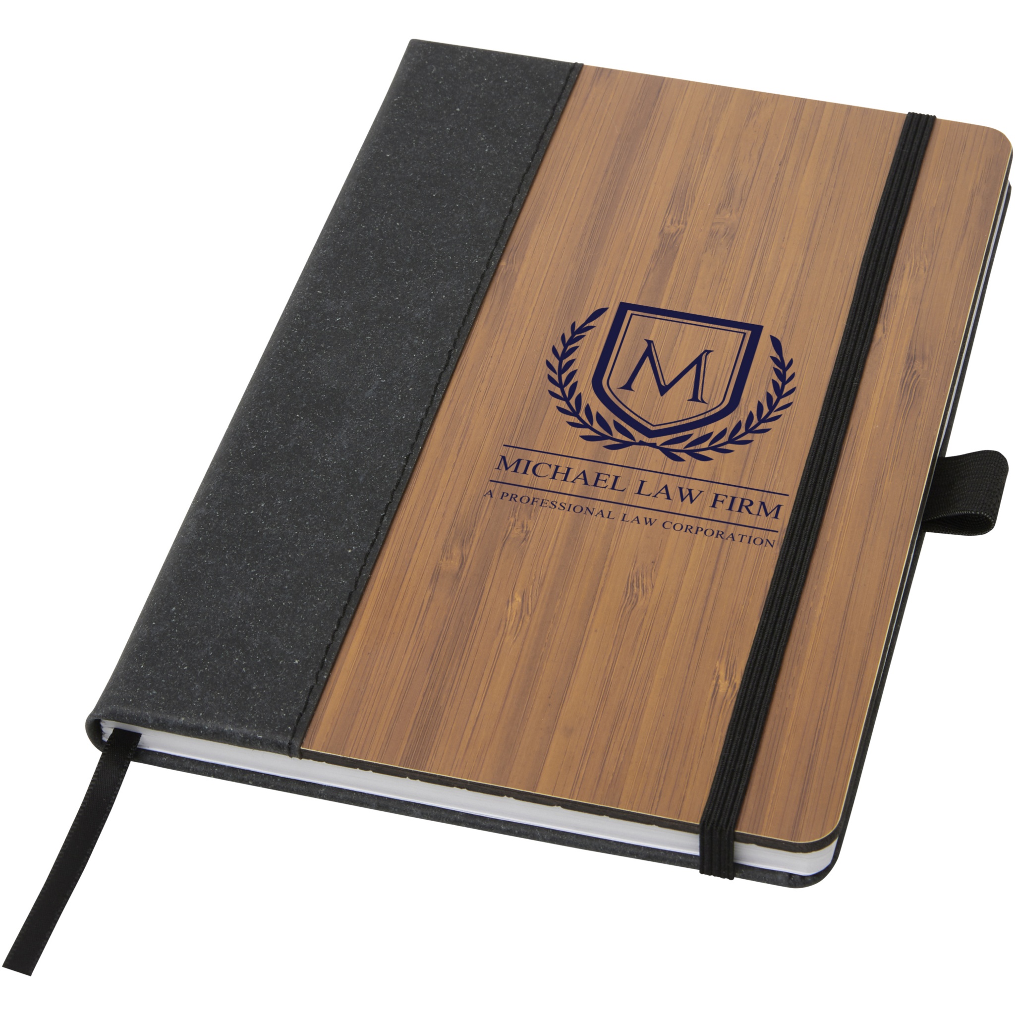 Блокнот формата А5 с бамбуковой обложкой и корешком из регенерированной кожи. 80 листов, линованная переработанная бумага плотностью 80 г/м2, черная петля для ручки, эластичная резинка и ленточка-закладка.