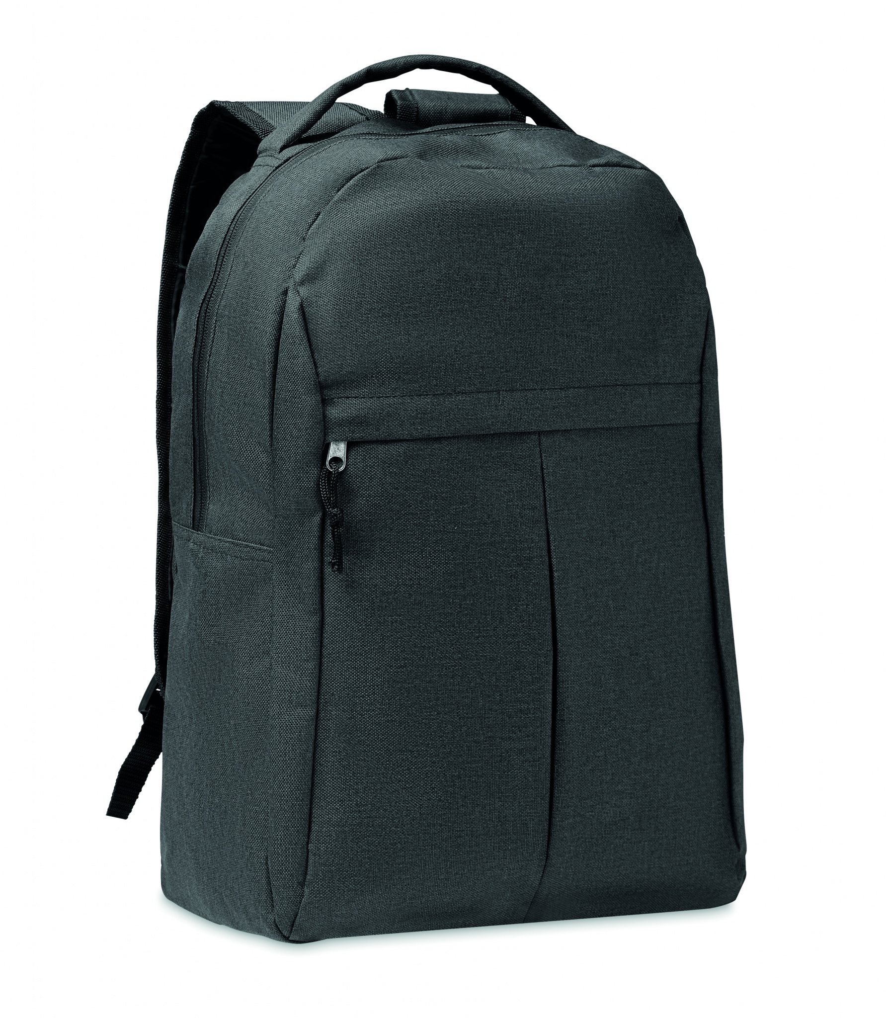 Рюкзак из двухцветного полиэстера 600D RPET с передним карманом на молнии и сетчатым карманом сбоку.