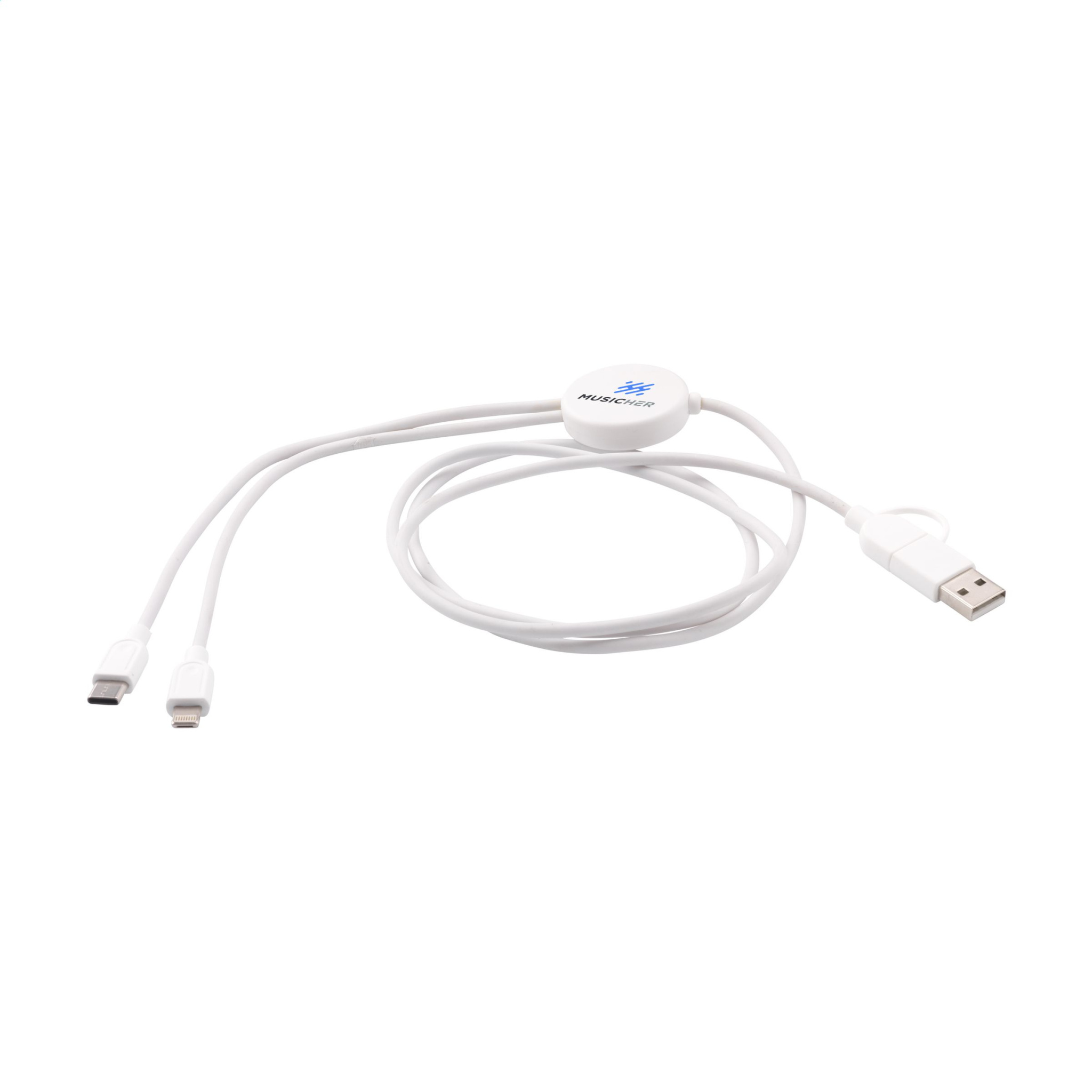 Зарядный кабель из переработанного АБС и переработанного ТПЭ. Вход: разъем Type-C и USB-A. Выход: Type-C и Lightning. Сертифицирован RCS. Общее количество переработанного материала: 62%. Длина кабеля: 120 см. Каждый предмет поставляется в индивидуальном конверте.