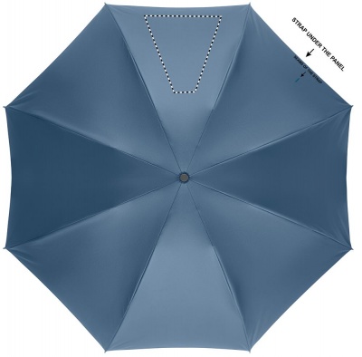 Зонт реверсивный 23-дюймовый из эпонжа RPET 190T. Автомат. Спицы из стекловолокна. Бамбуковая ручка с хлопковым ремешком на запястье. Футляр так же RPET.