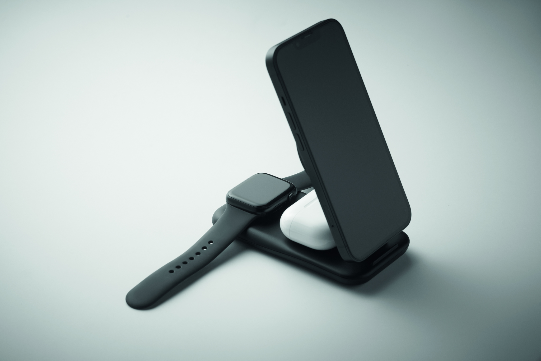 3 i 1 laddningsstation i ABS. Magnetisk trådlös laddare 15W, TWS-laddare och smartwatch-laddare (endast Apple®). Kompatibel med iPhone® 12 och nyare. Inklusive extra magnetisk metallring för att stödja laddning av andra icke-magnetiska trådlösa laddningsbara telefoner.