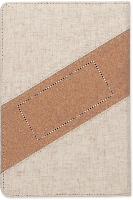 2-i-1-anteckningsbok. A5-anteckningsbok med integrerad trådlös laddare 15W. Med detaljer i bomull och kork på omslaget, 128 linjerade ark (64 ark). Bokmärke med band.