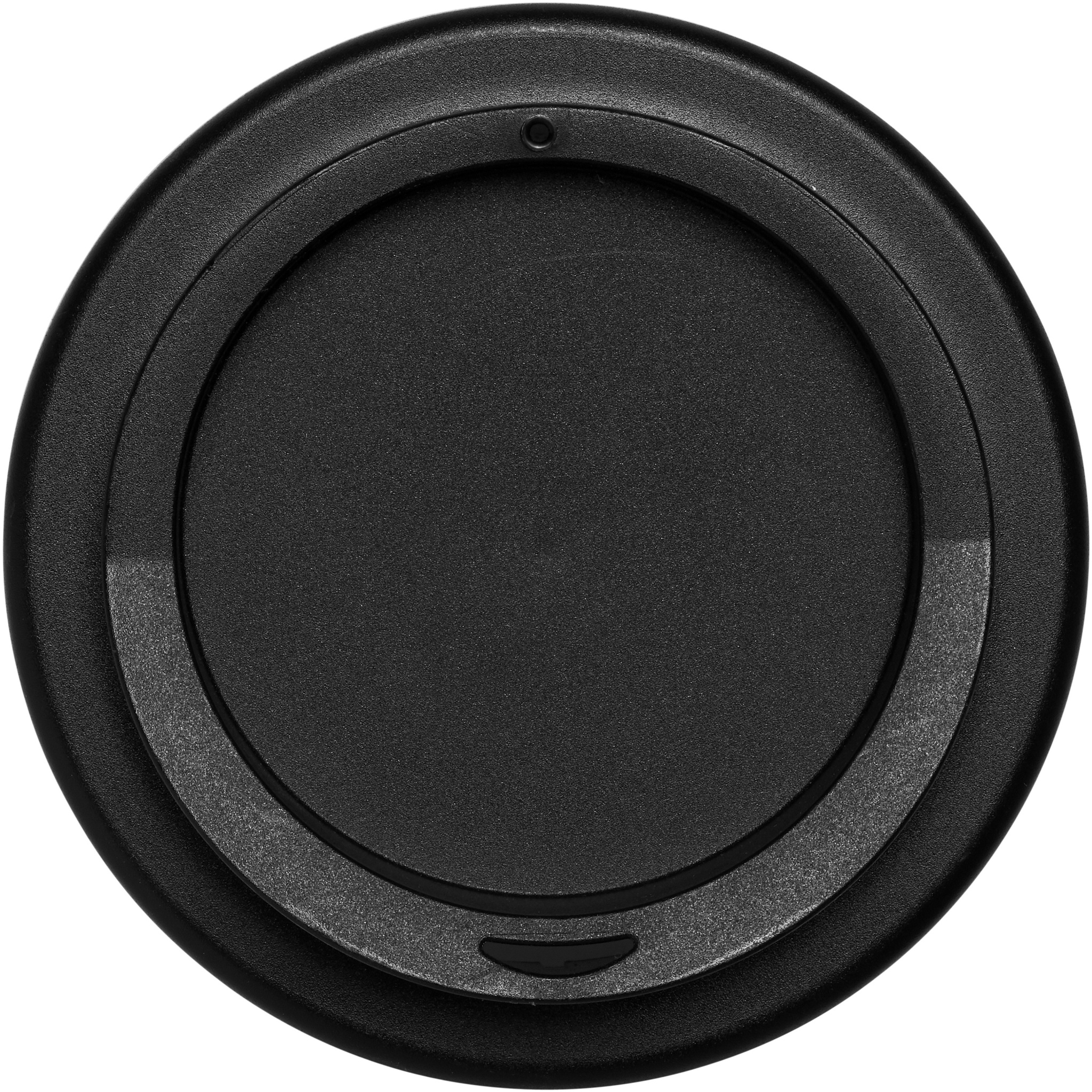 Kompat och dubbelväggisolerad termomugg med vridbart lock. Passar i de flesta kaffebryggare. Volymkapacitet 250 ml. Tillverkad av 100 % återvunnet material. Nyanserna av svart kan variera på grund av det återvunna materialets natur. Tillverkad i Storbritannien. Förpackad i en komposterbar påse.