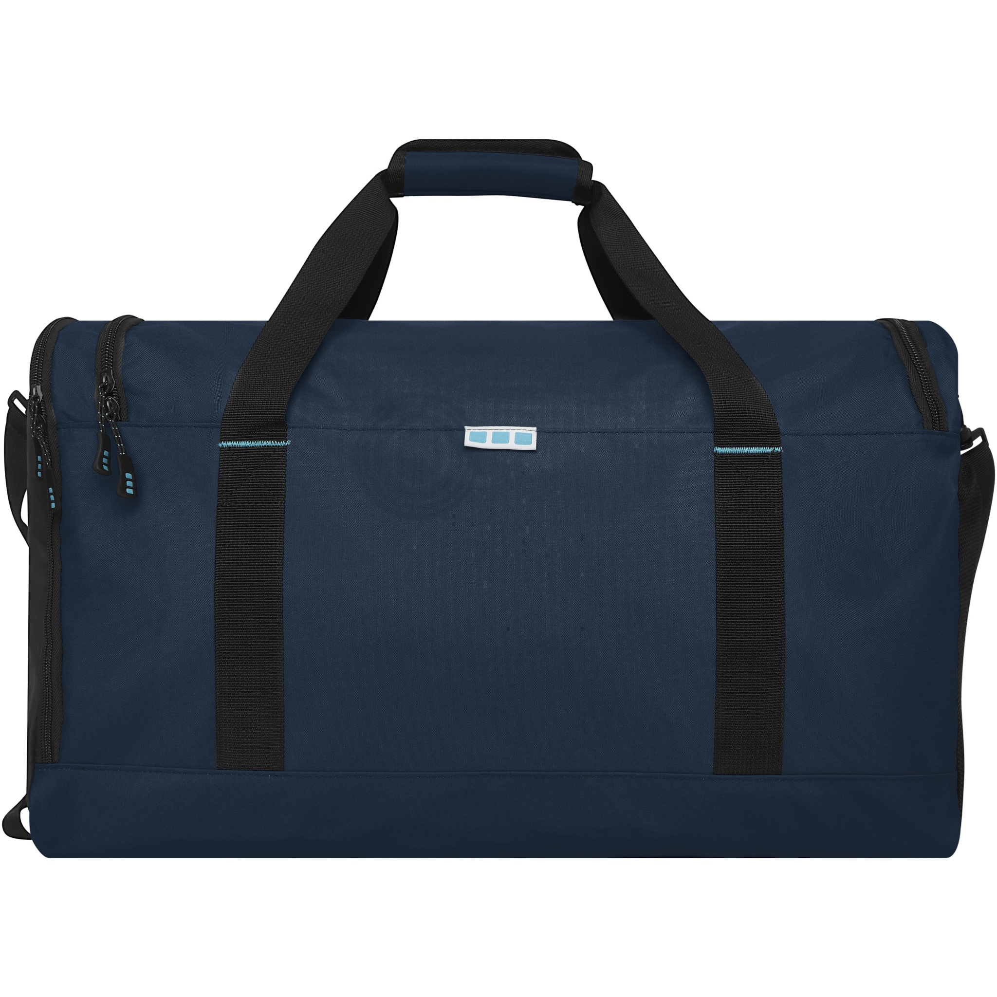 Hållbar GRS-certifierad RPET-duffelväska tillverkad med 55 % återvunnet material. Utrustad med ett stort huvudfack med blixtlås, en förstärkt baspanel, en nätficka på sidan, och en expanderbar våt/torr blixtlåsförsedd ficka. Levereras med en liten innerficka med dragkedja för organisering, avtagbar och vadderad axelrem, grepphandtag med vadderad kardborrestängning och ett extra grepphandtag på den nedre högra sidan.