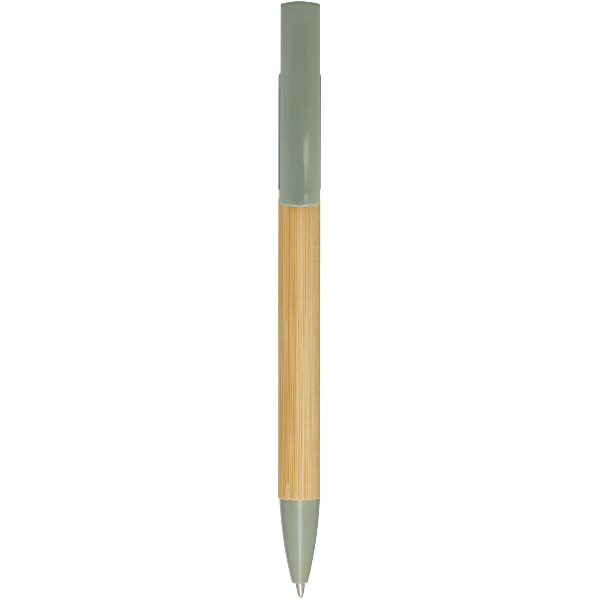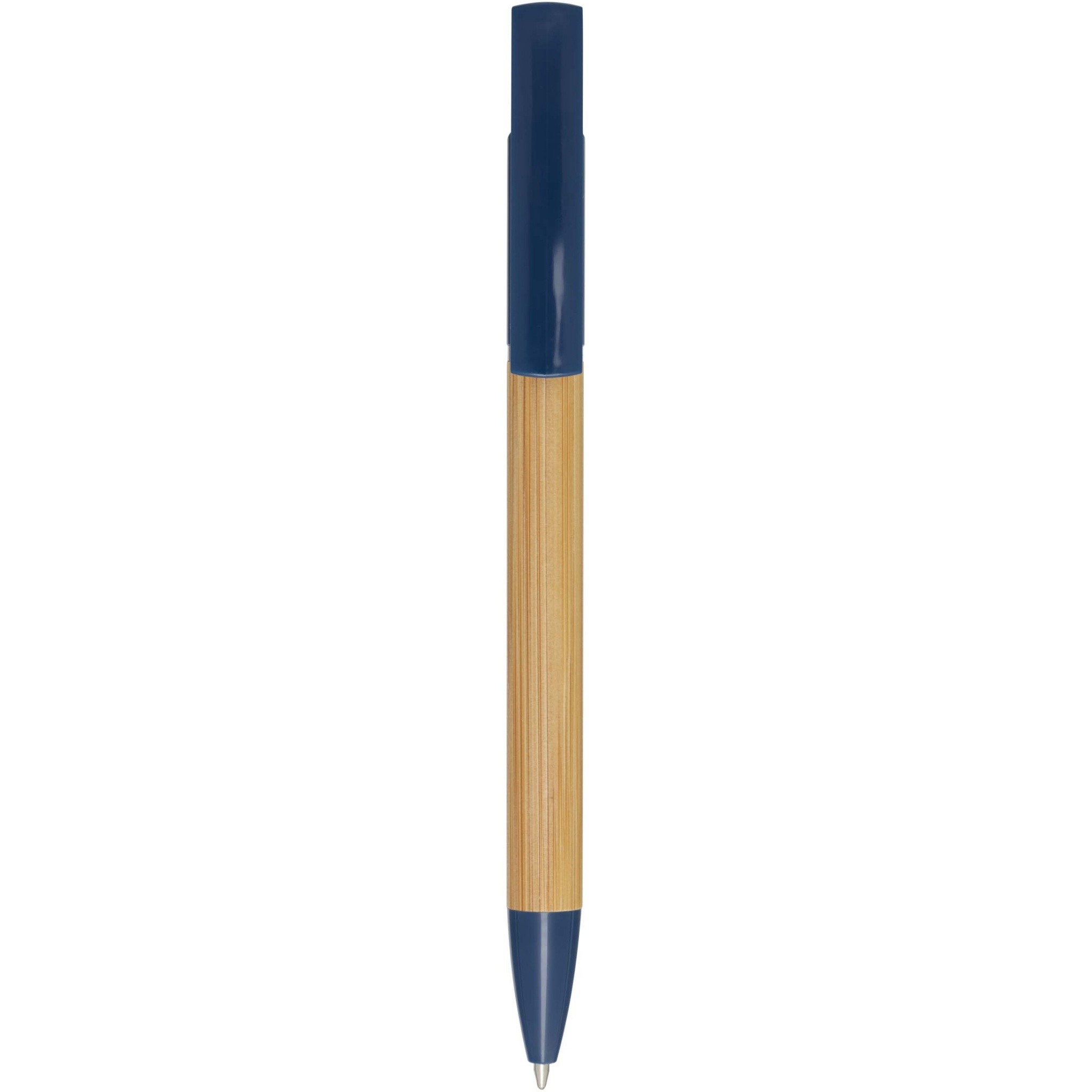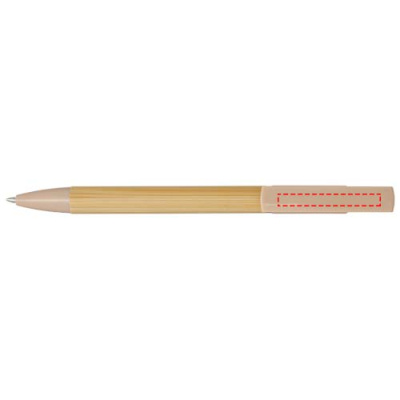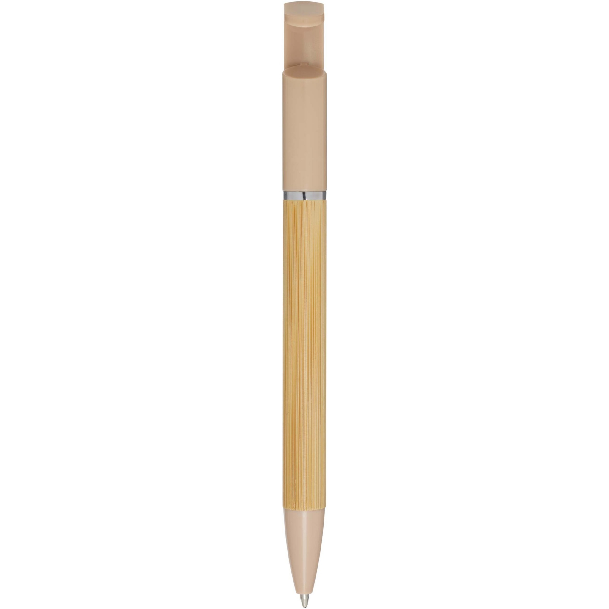 Kulspetspenna i bambu som också fungerar som telefonhållare. Knappen och mittringen är tillverkade av återvunnen plast, spetsen är tillverkad av mässing och pennkroppen är tillverkad av ansvarsfullt anskaffad bambu. Bläckfärg: Svart. Skrivlängd: 1000 meter. NIB-storlek: 1,0 mm.