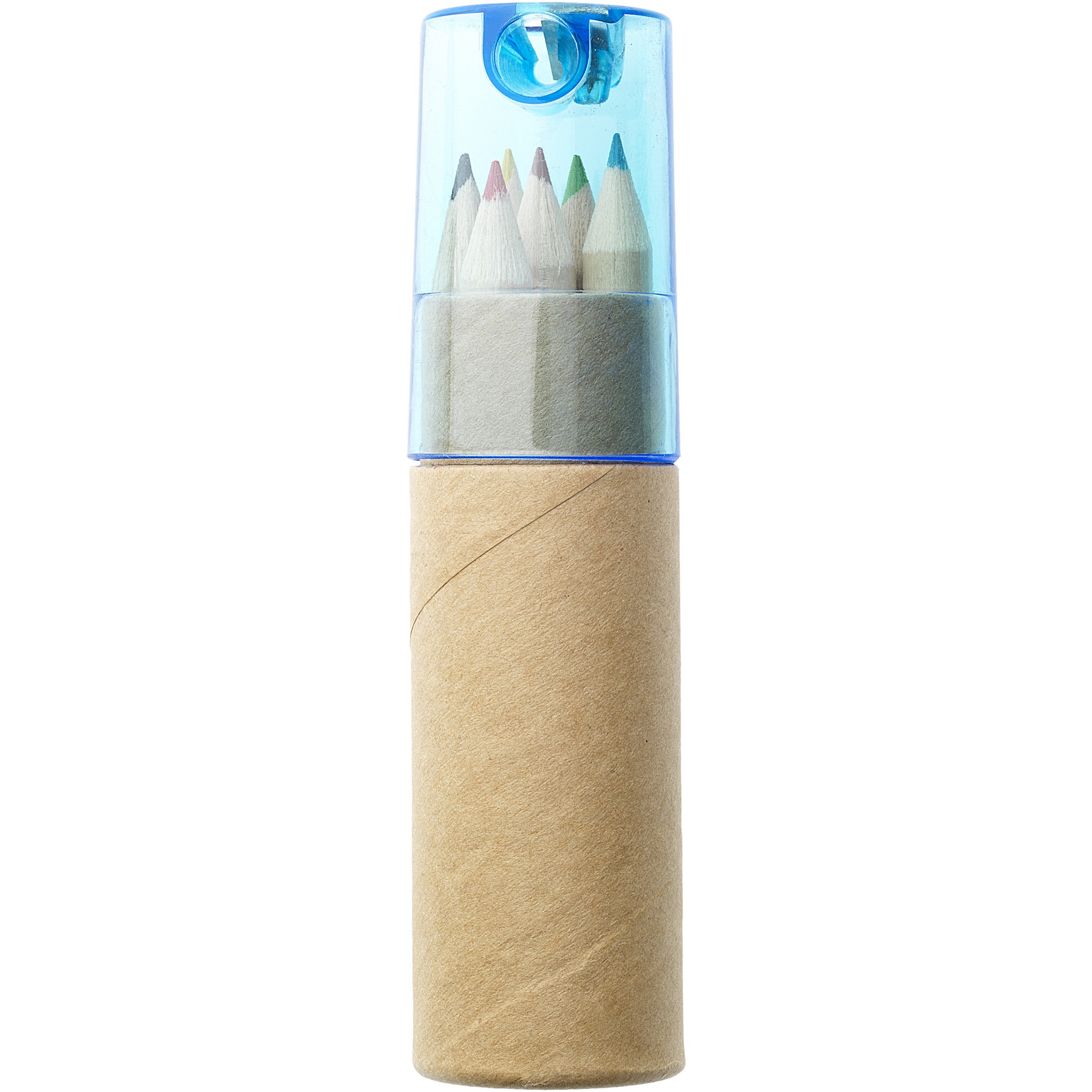 6 färgpennor i en pappcylinder med pennvässare i plastlocket. Endast förpackning kan märkas.