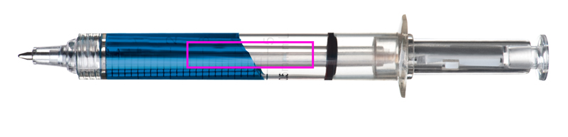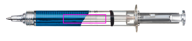 Gag-penna i form av en spruta, med blå eller röd skrivpåfyllning av plast. Vi kommer att trycka din logotyp i svart, mitt emot skalan.