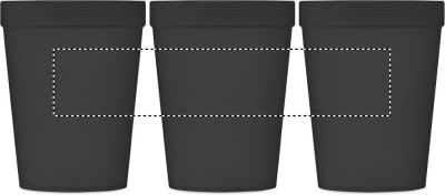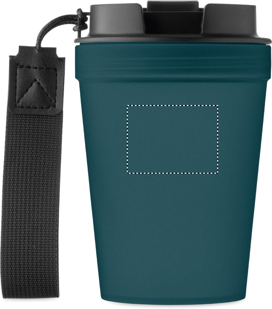 Enkelväggig take-away mugg i PP, med band i RPET-polyester. Läckagefri. Volym: 300 ml. Eftersom det här är en enkelväggig mugg kan värmeöverföring fortfarande förekomma.