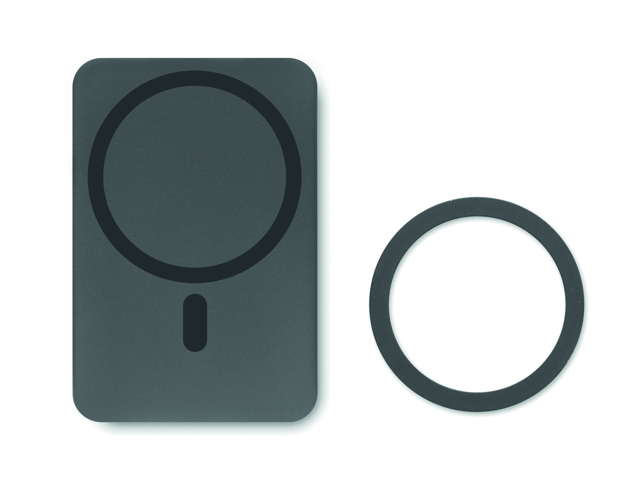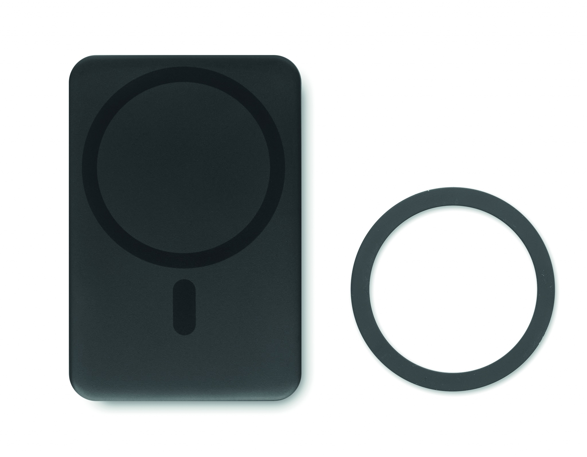 Magnetisk trådlös laddare (15 W) och powerbank (5000 mAh). Utgång: Uteffekt: DC 9V/1,1A (18W) idealisk för snabbladdning. Kompatibel med iPhone®X, 8 , Samsung 7 och nyare. Fungerar med alla enheter som har Qi-laddning. Inkluderar ytterligare magnetisk metallring för att stödja laddning av andra icke-magnetiska trådlöst laddningsbara telefoner. In/utgång: Typ-C