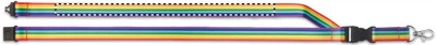 Regnbågsfärgad logoband Pride i RPET med metallkrok, snabbfäste och säkerhetsklips.