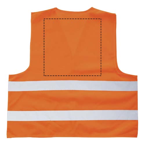 Säkerhetsväst klass 2 med hög synlighet som är lämplig för personer mellan 165 - 180 cm. Stort dekorationsområde på fram- och baksidan av västen. Kläder med hög synlighet för professionellt bruk. Fluorescerande bakgrund och reflexband. Specifikation EN ISO 20471:2013 + A1:2016. Dessa plagg är försedda med CE-märkning för att påvisa efterlevnad med EU-förordning 2016/425/EU personlig skyddsutrustning kategori II.