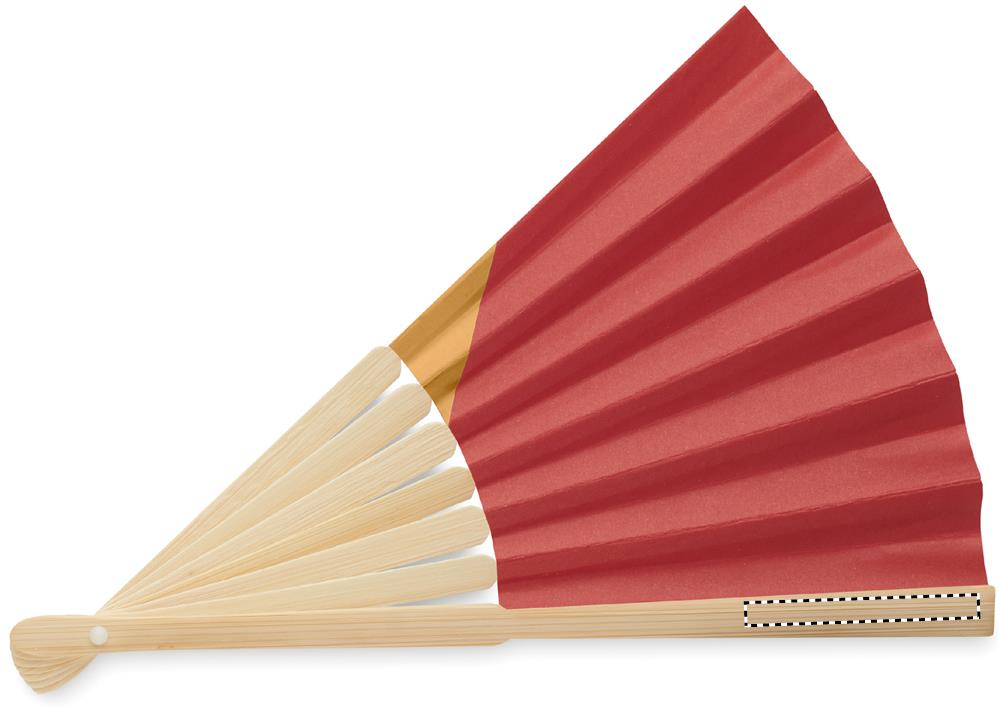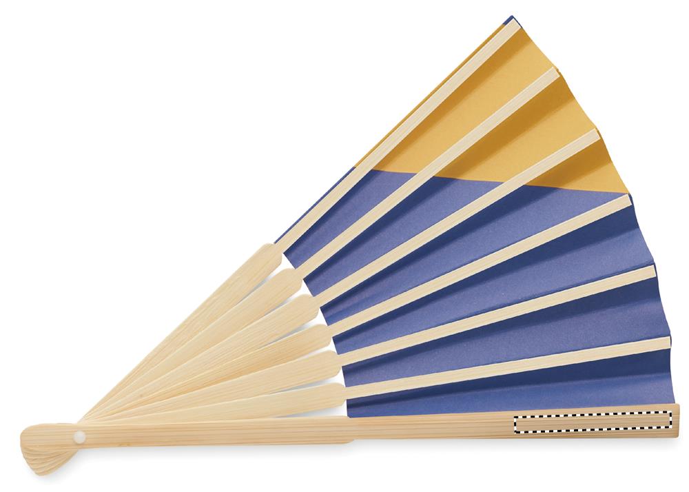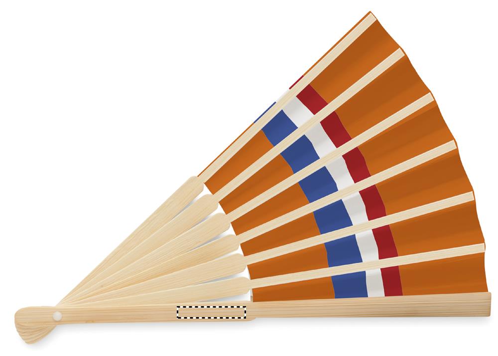 Manuell handfläkt i bambu med flaggdesign på papperstyg.