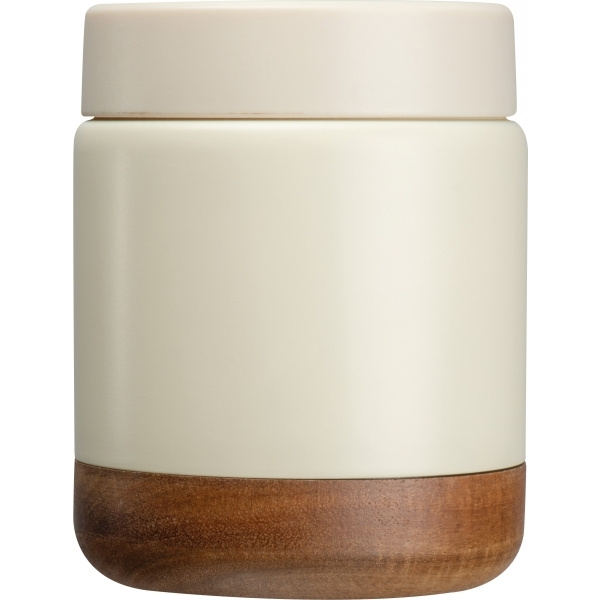 Dubbelväggig termolåda av återvunnet rostfritt stål. Den har ett skruvlock med akaciaträ och ett bärhandtag. Kapacitet 400 ml.