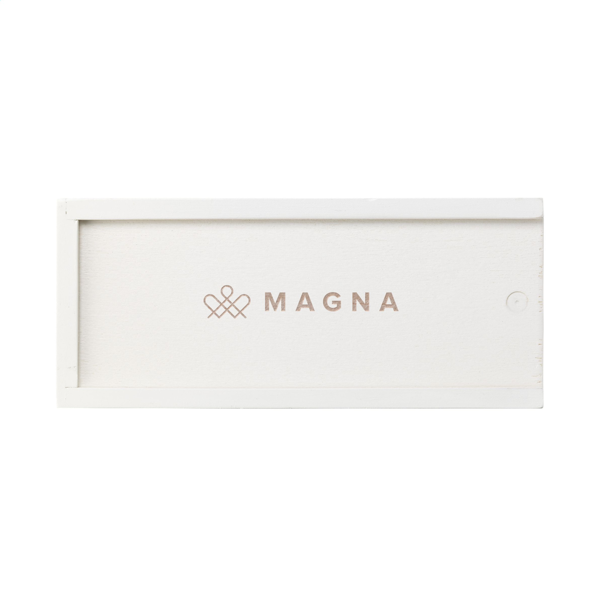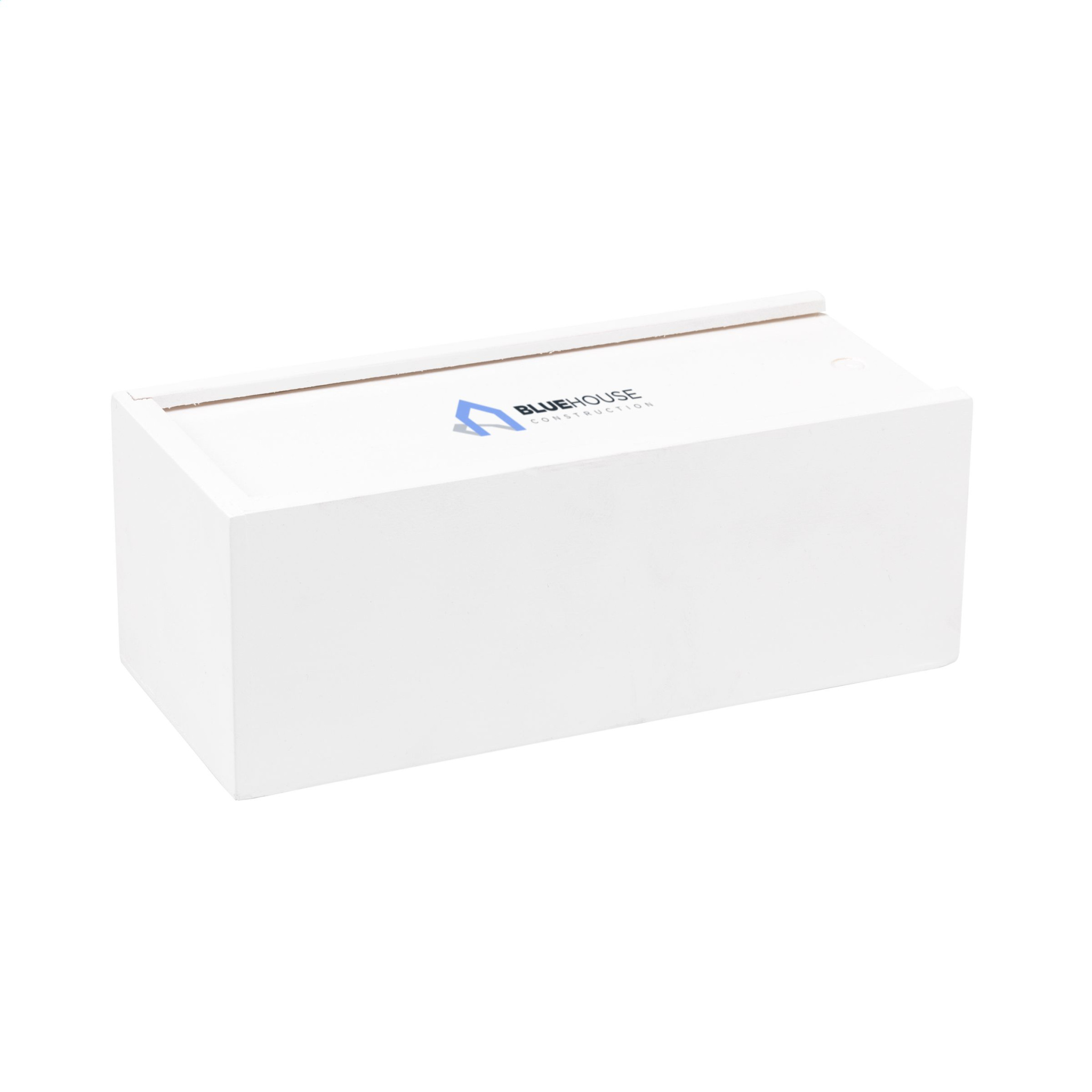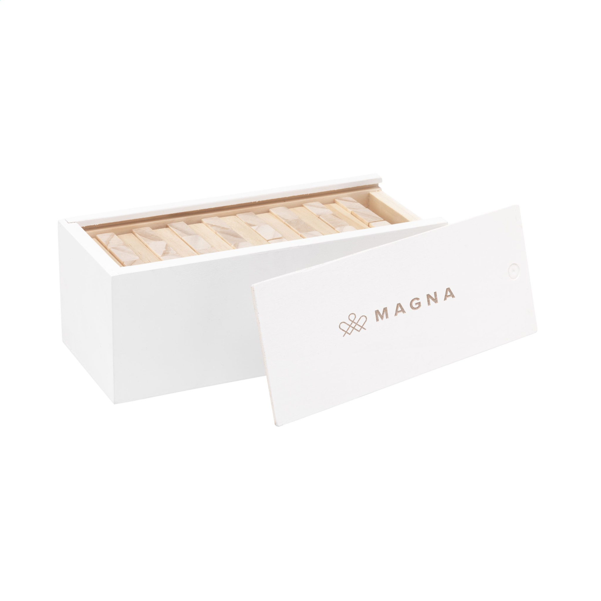 Trästapelspel (48 block). Tornmått 16,5 x 6 x 6 cm. Presenteras med en vit trälåda med skjutöppning för enkel förvaring. Inkl. instruktioner. Varje artikel levereras i en individuell brun kartong.